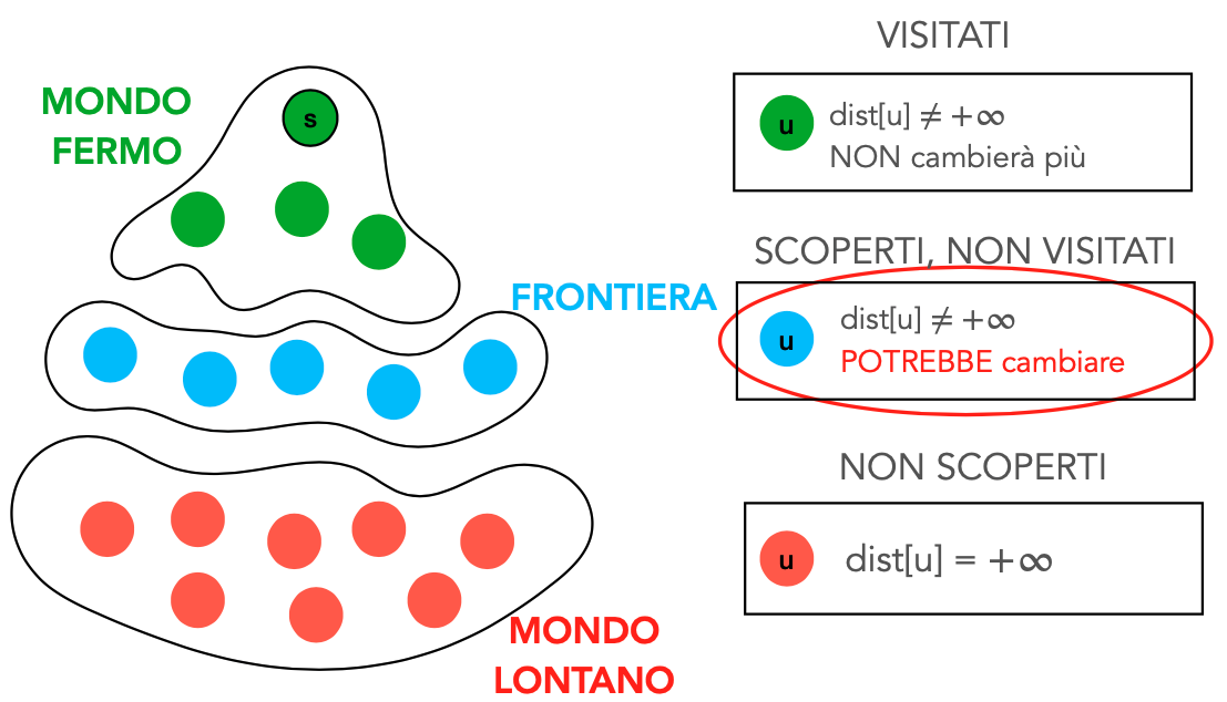 Dalla frontiera (coda con priorità) si prende il nodo che costa di meno in termini di cammino (dist[v]). Una volta che un nodo dalla frontiera viene spostato nel mondo fermo, non si può tornare indietro.