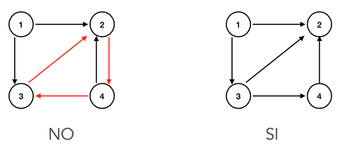 Nell’esempio corretto (quello di destra), il nodo 1 è un nodo sorgente, dal momento che non ha archi entranti, mentre il nodo 2 è un pozzo, perché non ha archi uscenti.