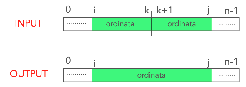 Nello pseudo codice appena scritto si richiama una procedura dal nome Merge. Questa prende in input due porzioni ordinate dell’array A, e ne fa il merge ordinato.