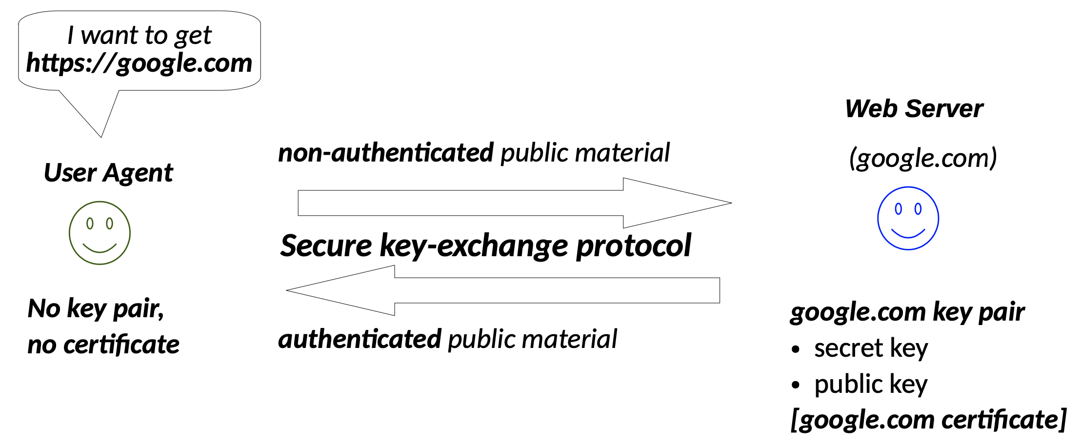 - Il server si calcola una chiave pubblica e invia allo user agent, con annessa firma digitale, e un certificato (che contiene la chiave pubblica)