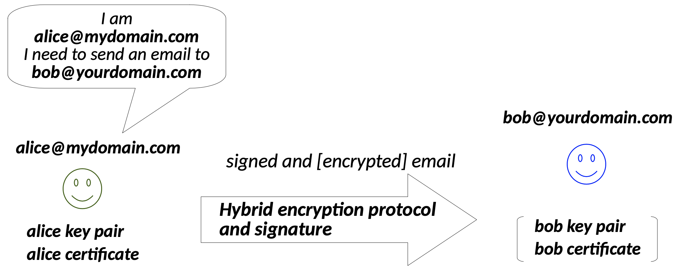È anche utilizzabile dai protocolli email S/MIME. L’identità che si va ad autenticare è alice@mydomain.com. L’obiettivo non è ottenere uno scambio di chiavi sicure, ma piuttosto di riuscire ad utilizzare correttamente uno schema di cifratura e firma.