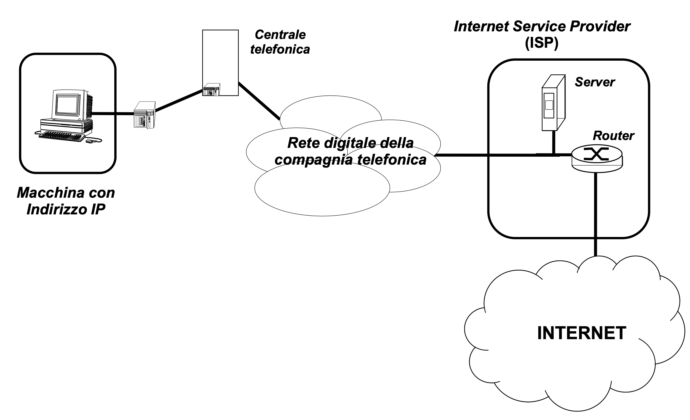Avviene tramite linee telefoniche attraverso il Point-to-point Protocol, che assegna dinamicamente un indirizzo IP per il solo tempo di connessione. Quell’unica connessione analogica sta passando piano piano ad un segnale digitale. Non servono altre infrastrutture dal momento che usa la rete telefonica. Come si accede?
