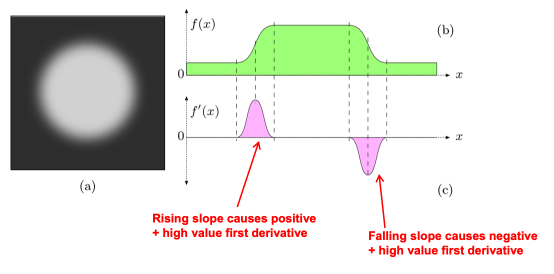 Sia $f(x, y)$ funzione 2D. Il **gradiente** è il vettore la cui direzione è nella direzione di massimo cambiamento di $f$ e la cui grandezza è il massimo tasso di differenza di $f$.Il gradiente è perpendicolare al bordo.