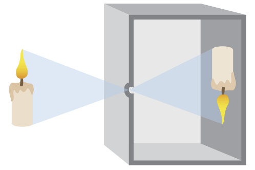 Scatola con buco. Più il buco è piccolo, più l’immagine prodotta è definita. L’immagine viene proiettata sul lato opposto rovesciata. Il fuoco è su tutti gli oggetti. Serve un tempo piuttosto lungo per imprimere l’immagine, dal momento che dal buco entra poca luce.
