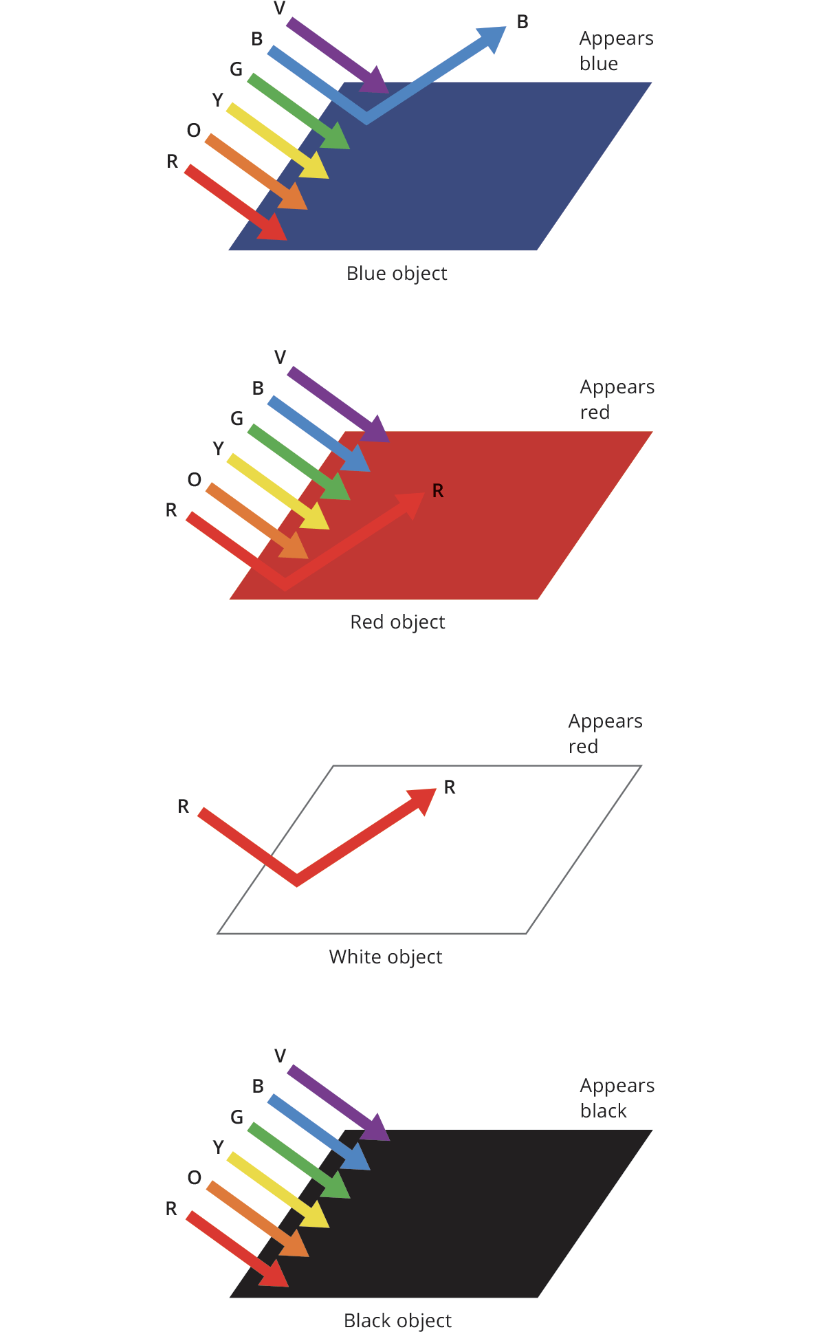 Se invece si vuole avere una riflessione scura, si deve illuminare con il colore complementare a quello dell’oggetto, così da far assorbire tutta la luce all’oggetto.