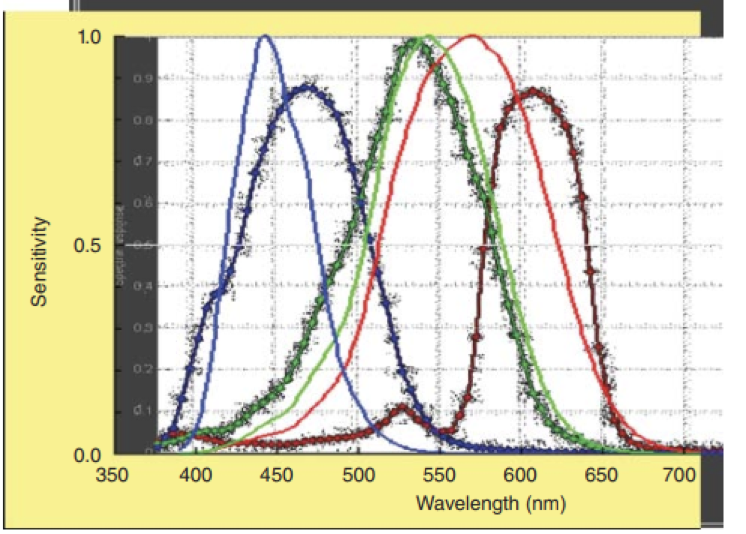 La sensibiltà spettrale dell’occhio umano e quella del sensore policromatico standard sono simili per quanto riguarda il verde, ma si discostano di molto per quanto riguarda blu e rosso. Si deve applicare quindi una correzione del colore, che non è altro che una matrice di coefficienti che trasforma il vettore contenente il valore della tripletta di un singolo pixel nel suo valore corretto.
