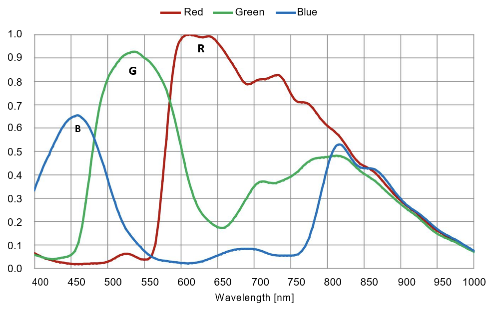 I grafici indicano quanto efficientemente la luce viene registrata dal sensore. Le camere riescono a prendere lunghezze d’onda che vanno dai 350 ai 900 nm.